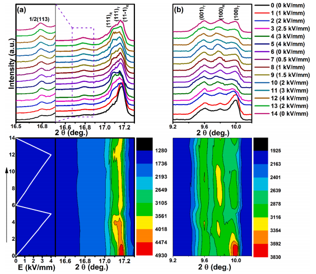 图 对于 x = 0.19 的样品,(a) (111)c 反射和 1/2(113) 超结构峰以及 (b) (100)c 反射随着电场变化的演变。相应的等高线图显示在下方,其中峰强度和位置的相对变化更为清晰