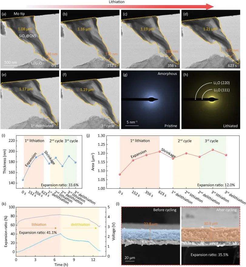 图 SiO2@CNS锂化/脱锂过程的原位透射电镜观察