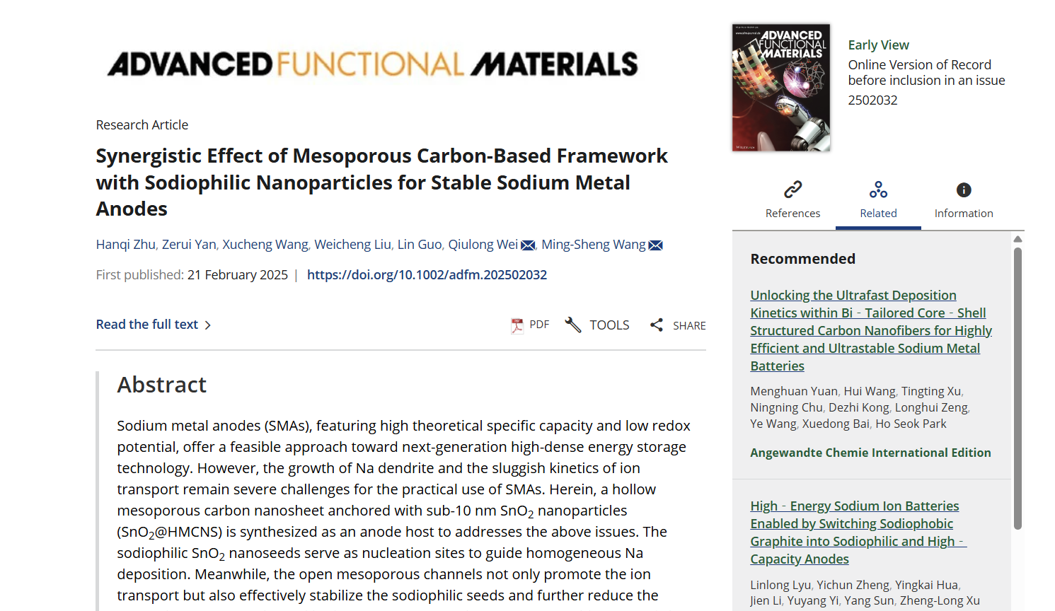 这篇论文主要研究了一种结合介孔碳基框架与亲钠纳米颗粒的协同效应,用于稳定钠金属负极的设计与性能优化。研究团队通过化学修饰和结构设计,成功合成了负载小于10 nm SnO2纳米颗粒的中空介孔碳纳米片(SnO2@HMCNS)作为钠金属负极宿主材料。这种设计不仅解决了钠枝晶生长的问题,还显著提升了离子传输效率。SnO2纳米颗粒作为亲钠位点引导均匀的钠沉积,而开放的介孔通道则促进了离子传输并有效稳定了亲钠种子,从而降低了成核过电位,并实现了长期无枝晶的钠沉积。